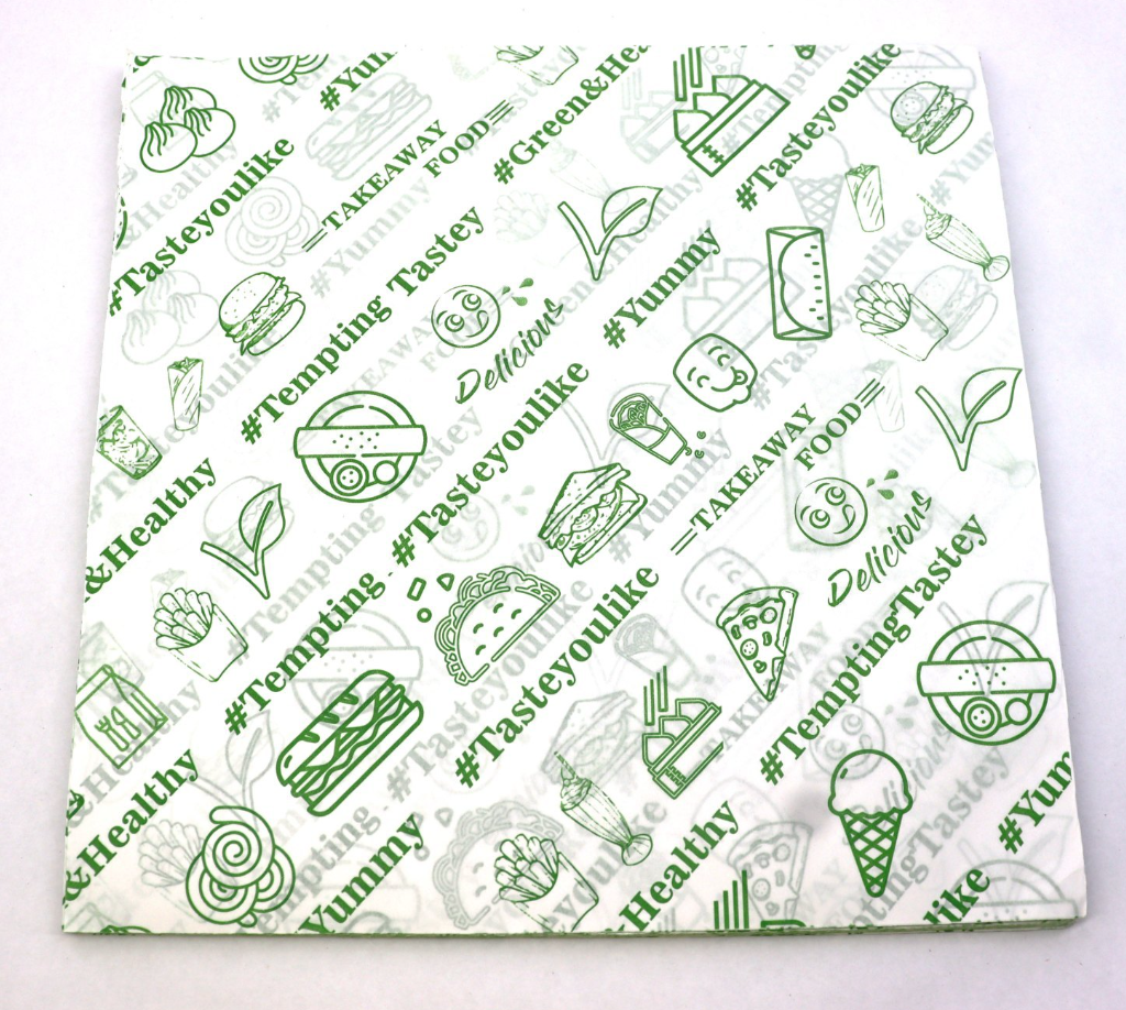 VEG green Printed food grade ink one side coated butter paper – Premium food-grade butter paper in VEG green with one side coating and custom printed designs. At 60 GSM, it is lightweight yet strong, grease-resistant, and ideal for vegetarian food packaging, ensuring hygiene and visual appeal.